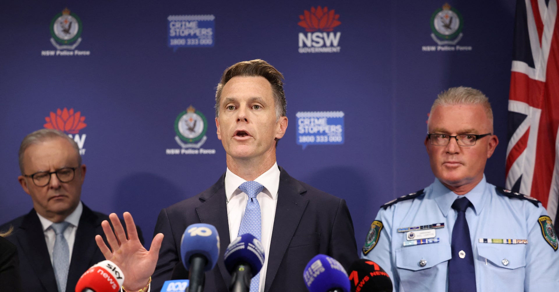 Australian Prime Minister Anthony Albanese and NSW Police Commissioner Mal Lanyon stand behind NSW Premier Chris Minns as he speaks during a press conference at NSW Police headquarters, following a deadly shooting incident during a Jewish holiday celebration at Bondi Beach, in Sydney, Australia, December 16, 2025. REUTERS/Hollie… Purchase Licensing Rights , opens new tab Read more