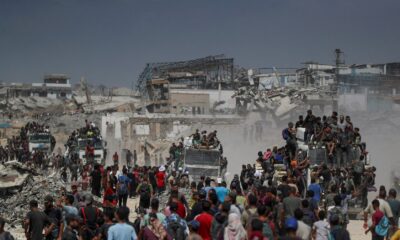 By Emily Rose Palestinians climb onto trucks as they seek for aid supplies that entered Gaza through Israel in Beit Lahia,...