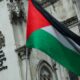 Item 1 of 3 A person holds a Palestinian flag outside the High Court on the day of a hearing about...