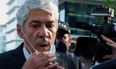 Portugal’s former Prime Minister Jose Socrates holds his protective mask as he leaves the court in Lisbon, Portugal, April 9, 2021....
