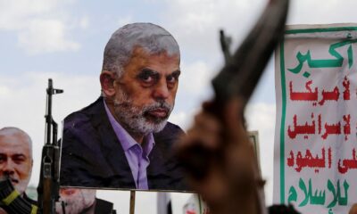 A person holds a cut-out depicting late Hamas leader Yahya Sinwar as protesters, predominantly Houthi supporters, demonstrate to show solidarity with...