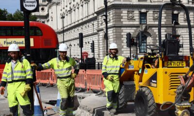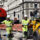 Workmen pause as they dig up a section of road in Westminster during a heatwave, in London, Britain, August 12, 2025....