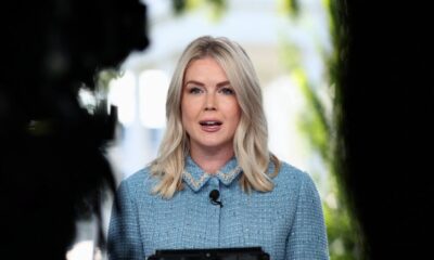 White House Press Secretary Karoline Leavitt speaks before a TV news camera at the White House in Washington, D.C., U.S., August...