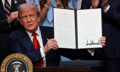 By Jack Queen U.S. President Donald Trump holds up an executive order in the South Court Auditorium on the White House...