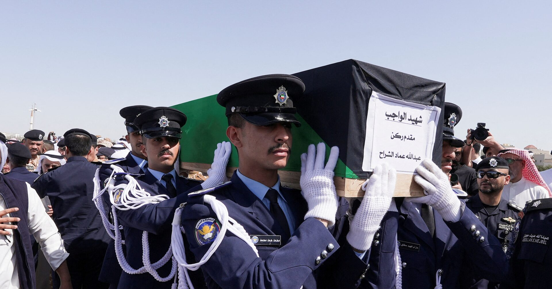 [1/2] Guards of Honour carry the coffin of one of two police officers, who were killed while performing their duties, during their funeral procession at a graveyard in Kuwait City, Kuwait, March 9, 2026…. Purchase Licensing Rights , opens new tab Read more