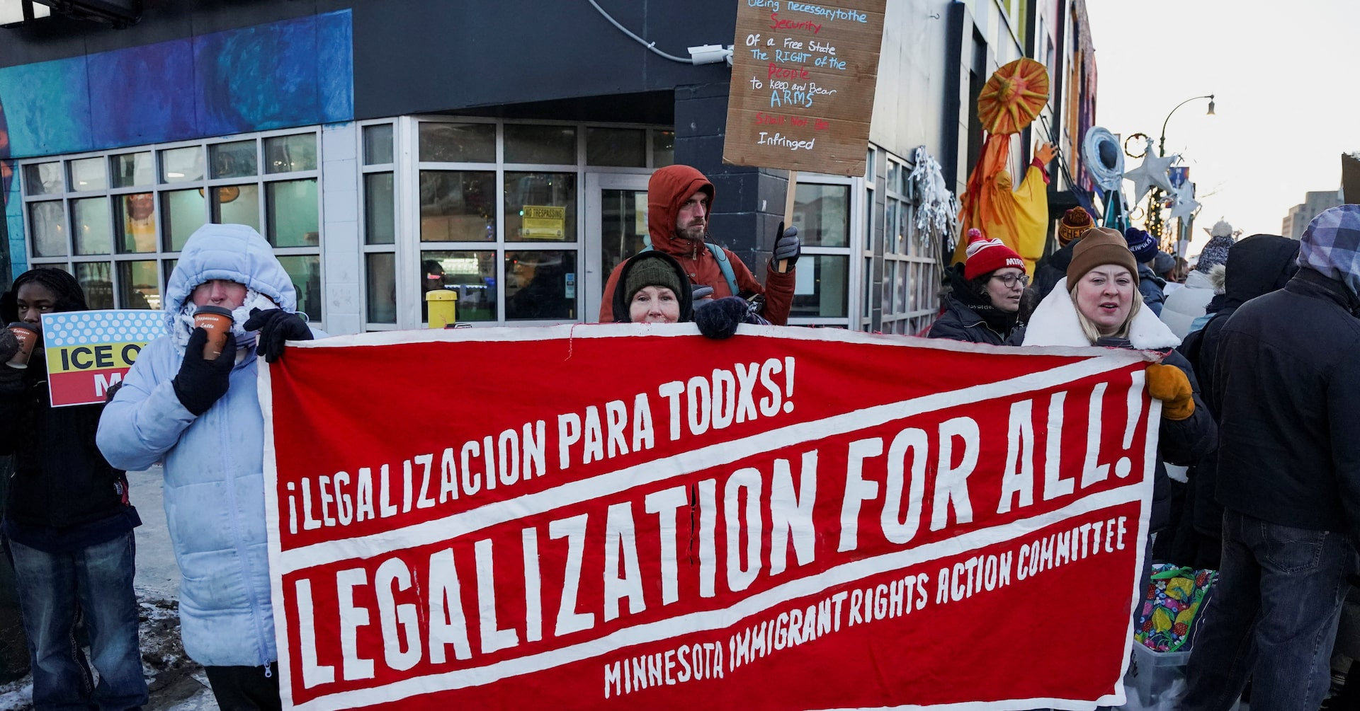People hold a banner during a demonstration against the presence of federal immigration agents in Minneapolis, Minnesota, U.S., January 28, 2026. REUTERS/Seth Herald Purchase Licensing Rights , opens new tab