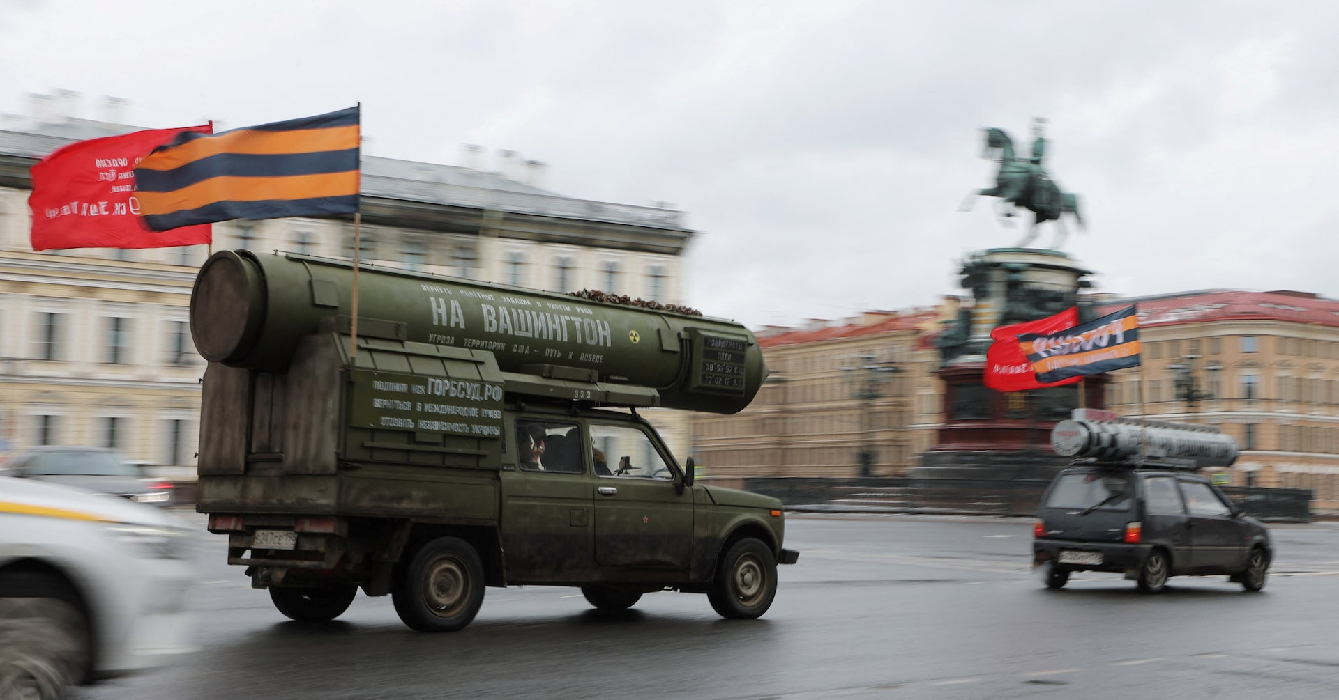 A vehicle with a model of a Russian missile on its top and attached Soviet-era flags drives along a square in Saint Petersburg, Russia March 16, 2025. REUTERS/Anton Vaganov Purchase Licensing Rights , opens new tab