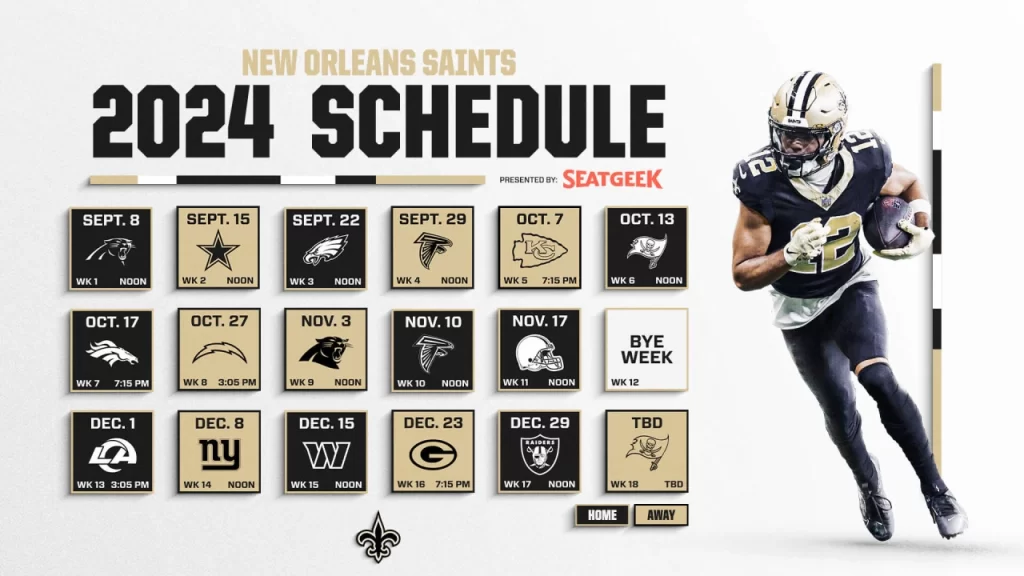 The New Orleans Saints have unveiled their 2024 schedule featuring an exciting lineup of games that includes three prime-time showdowns. The Saints will kick off their season with a home game against their NFC South rival, the Carolina Panthers, on Sunday, September 8th at noon CT. This marks the second consecutive year the Saints open their season at the Caesars Superdome, and they’ll be looking to extend their impressive streak of five consecutive season-opening victories.